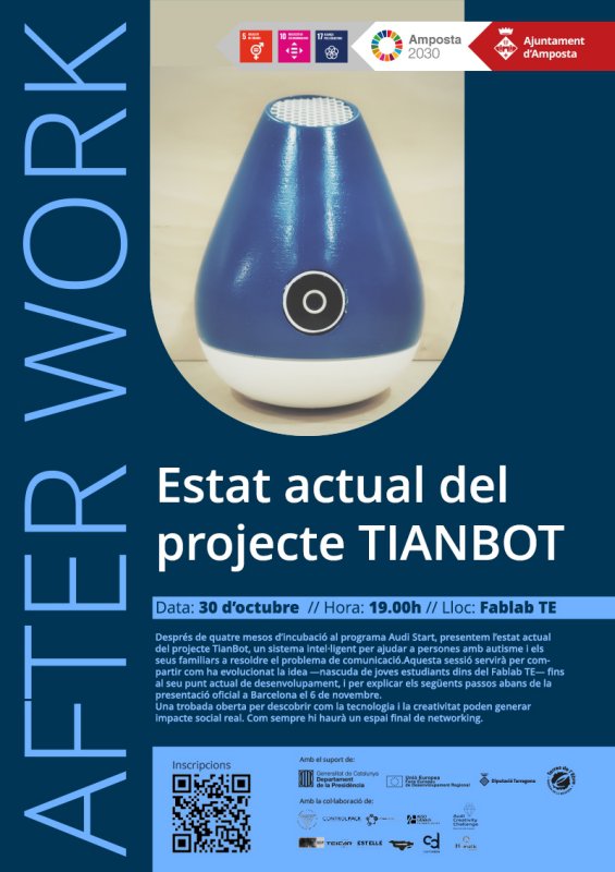 Després de quatre mesos d’incubació al programa Audi Start, presentem l’estat actual del projecte Tianbot, un sistema intel·ligent per ajudar a persones amb autisme i els seus familiars a resoldre el problema de comunicació. Aquesta sessió servirà per compartir com ha evolucionat la idea -nascuda de joves estudiants dins del Fablab TE- fins al seu punt actual de desenvolupament, i per explicar els següents passos abans de la presentació oficial a Barcelona el 6 de novembre.